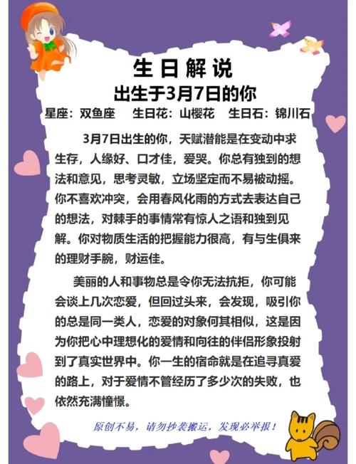 在茫茫人海中,三月初七的生日人如同一顆璀璨的星星,閃耀著獨(dú)特的光芒。他們的命運(yùn)宛如一曲交響樂,豐富多彩,變幻無常。我們將深入探討三月初七生日人的命運(yùn)特征,以及如何利用這些特質(zhì)來塑造更加美好的人生。