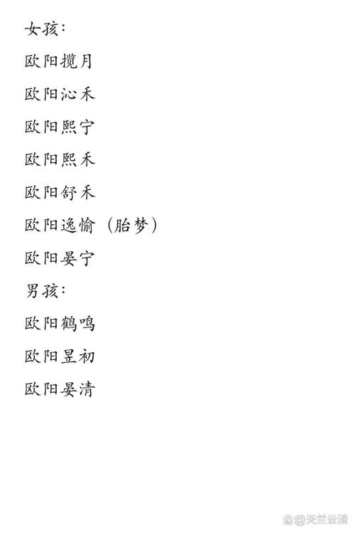 歐陽寶寶妍: “妍”字代表美麗、美好,是女性取名中常見的字眼。與“歐陽寶寶”搭配,簡潔明了,寓意著女孩未來容貌姣好,生活幸福。