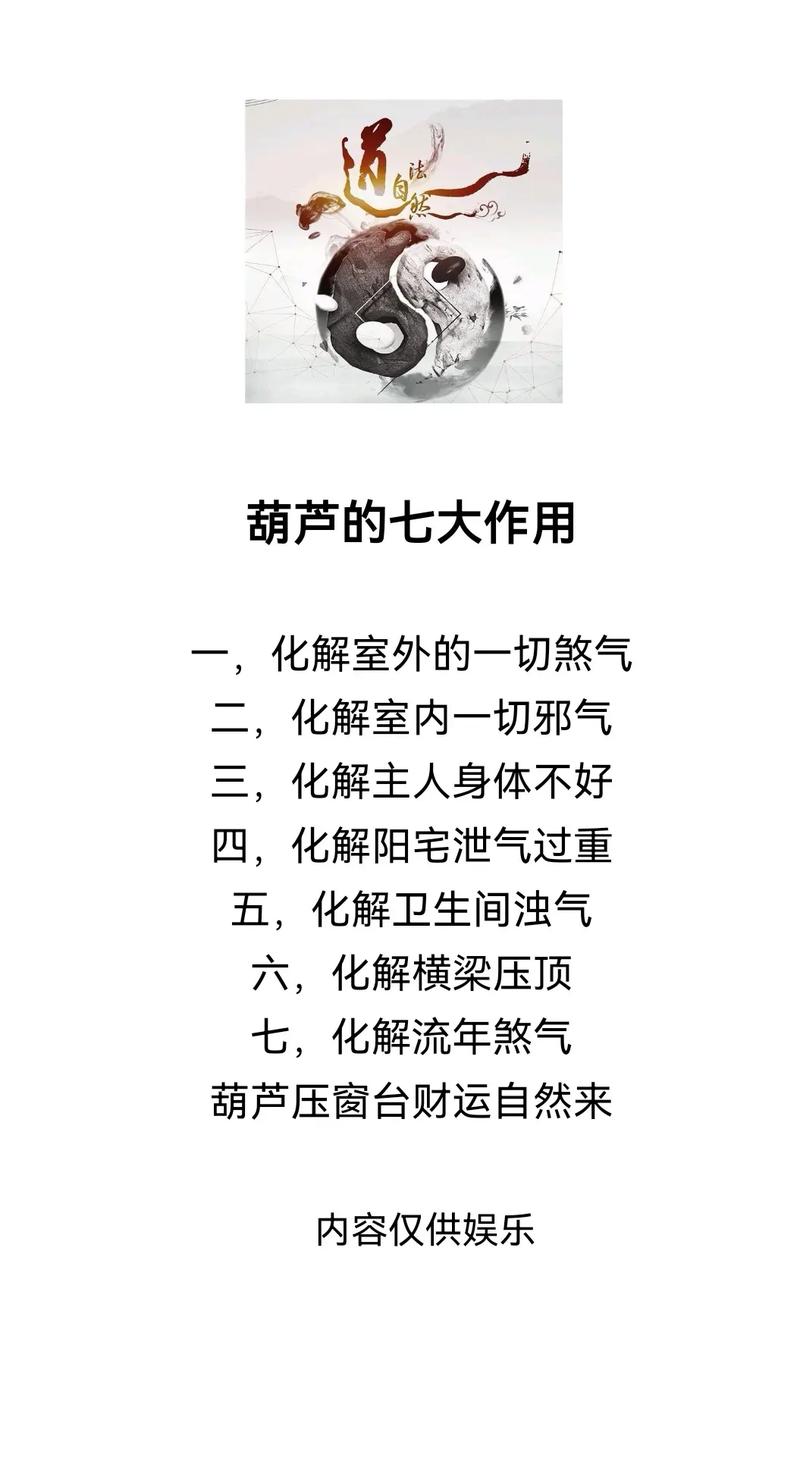 葫蘆有著天然的辟邪擋煞的作用。它的形狀像一個天然的聚氣筒,可以將煞氣吸附到里面,然后通過葫蘆嘴釋放出去。