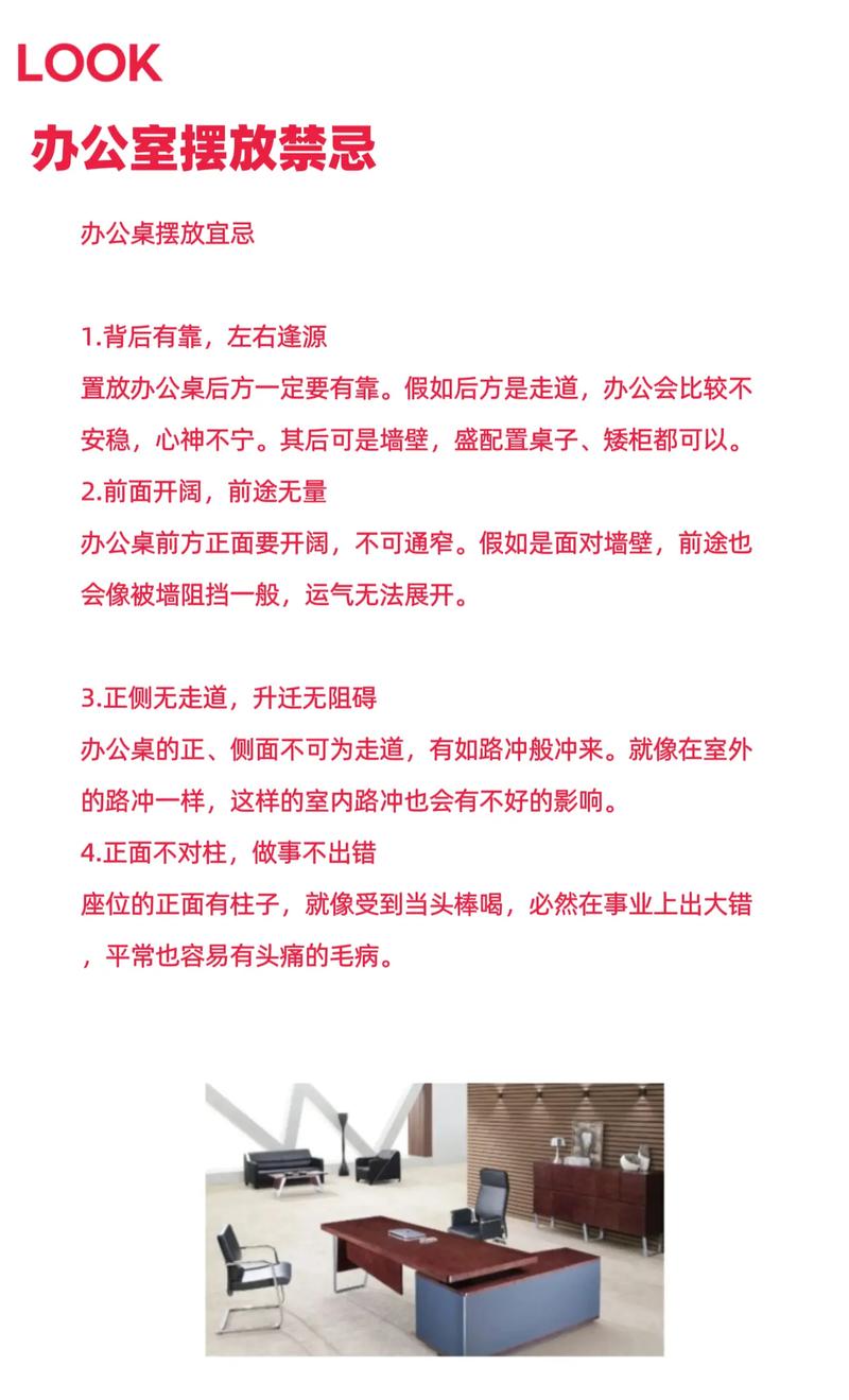 以上便是寫字臺(tái)朝向的一些風(fēng)水禁忌,如果您犯了其中一條,那可要趕緊調(diào)整位置,以免影響您的事業(yè)運(yùn)和財(cái)運(yùn)。犯了老板給你降工資,別怪我沒提醒你!