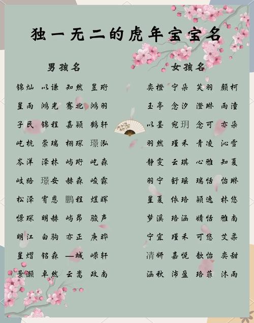 虎寶寶男寶寶起名是一件需要認(rèn)真對(duì)待的事情。通過(guò)結(jié)合虎的特性、傳統(tǒng)文化、音韻字形、五行八字等因素,我們可以為寶寶取一個(gè)好聽(tīng)順口、寓意深遠(yuǎn)、能夠伴隨其一生發(fā)展的名字。希望以上建議能為您提供一些幫助,祝您的虎寶寶健康成長(zhǎng),前程似錦!