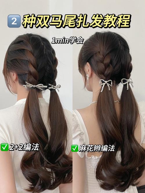 2. 將馬尾分成左右兩股,逆時針旋轉(zhuǎn),再順時針旋轉(zhuǎn),形成兩股麻花辮。