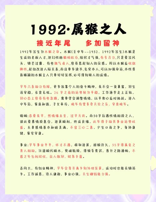 在中國(guó)傳統(tǒng)文化中,生肖的影響不可小覷。尤其是1992年出生的猴子,他們的命運(yùn)更是吸引了眾多命理愛(ài)好者的目光。那么,92年的猴子究竟是什么命呢?今天,我們將深入探討這一話題,揭示他們的個(gè)性特征、運(yùn)勢(shì)及人生軌跡。