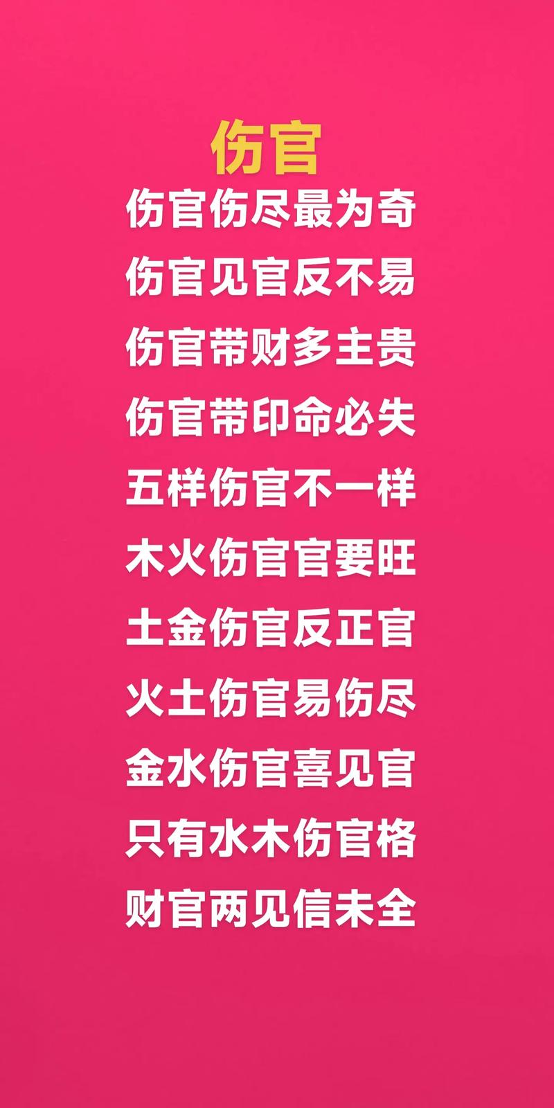 傷官生財,傷官吐秀,傷官傷盡皆吉利,傷官配印可成名,傷官見官不是兇,傷官遇食指頭疼,傷官逢財樂悠悠。