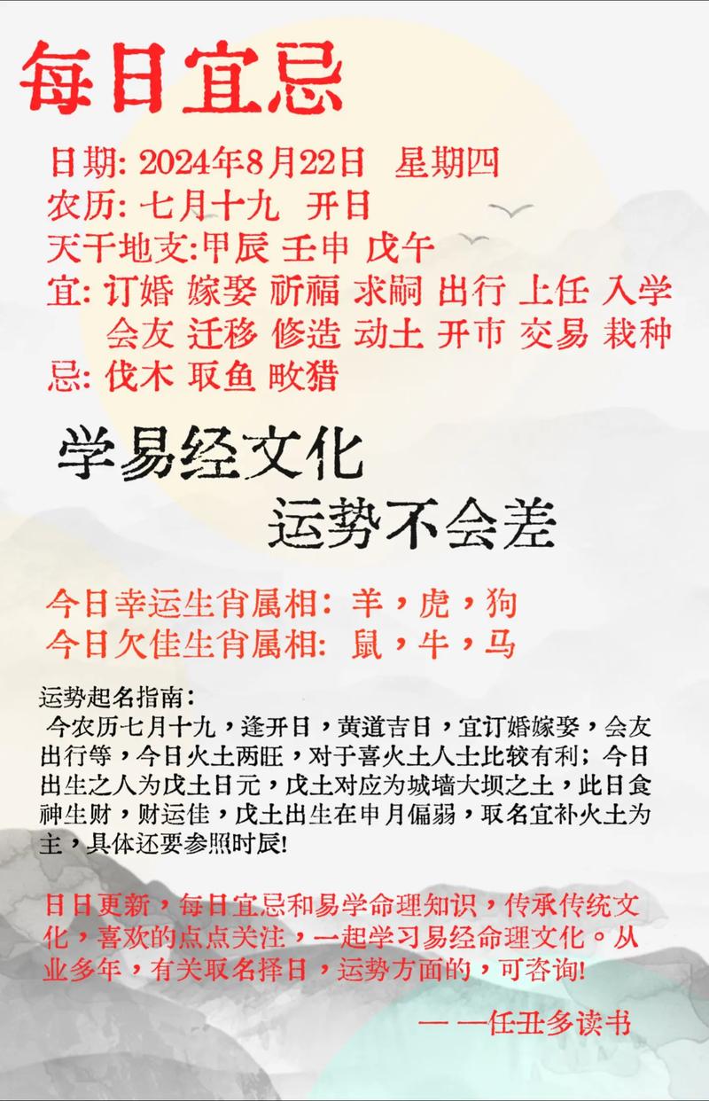 農(nóng)歷七月十九日,一個(gè)吉祥的時(shí)刻,在這個(gè)特殊的日子里,萬(wàn)事具備,適合舉辦各種重要活動(dòng),讓美好與幸運(yùn)伴隨左右。