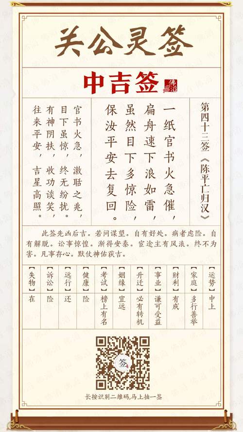 在關(guān)公靈簽43中,關(guān)公建議你保持冷靜和耐心。你應(yīng)該避免做任何沖動(dòng)或魯莽的事情。你應(yīng)該仔細(xì)考慮你的選擇,并確保你在做出決定之前已經(jīng)考慮到了所有可能的因素。