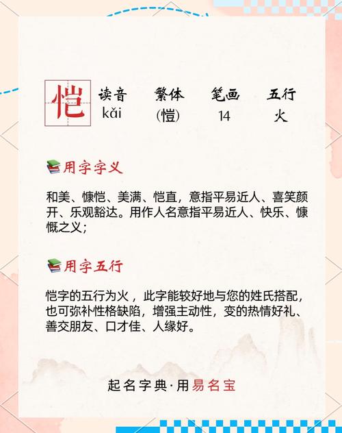 將二字組合,“以愷”寓意著用快樂的方式去實現自己的目標,憑借自身的能力去創(chuàng)造幸福的生活。這種積極向上的寓意,對命主的人生發(fā)展具有積極的引導作用,有助于其形成樂觀自信的性格,勇于面對挑戰(zhàn),追求美好未來。