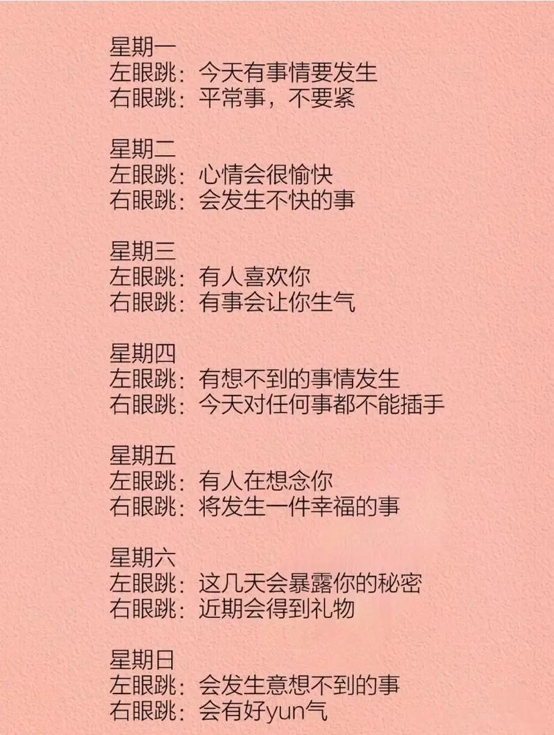 然而,在民間文化中,星期二的眼皮跳動(dòng)卻有著不同的寓意。根據(jù)不同的說法,左眼皮跳和右眼皮跳的預(yù)示也不同: