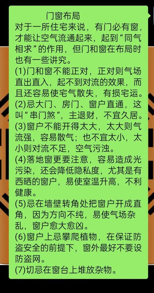 門窗風(fēng)水也有很多禁忌,如門窗正對(duì)電梯、樓梯、廁所、垃圾桶等,這些都會(huì)帶來(lái)煞氣、霉運(yùn),應(yīng)盡量避免。