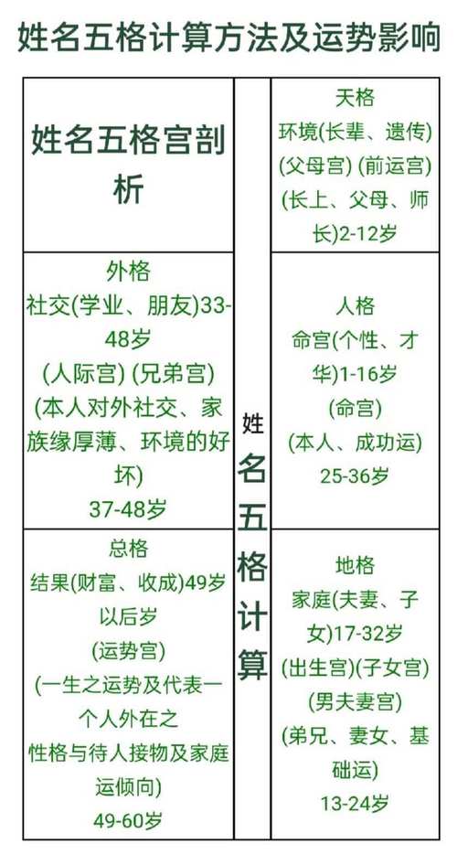 五格剖象法的核心在于將漢字筆畫(huà)數(shù)轉(zhuǎn)換為數(shù)理,并賦予其吉兇屬性。它將姓名分為五個(gè)維度,即天格、人格、地格、總格和外格,分別代表不同的意義: