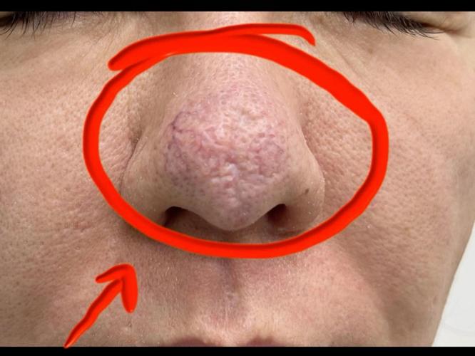 毛細血管擴張:鼻子表面可見明顯的紅血絲,像蜘蛛網(wǎng)一樣分布。
