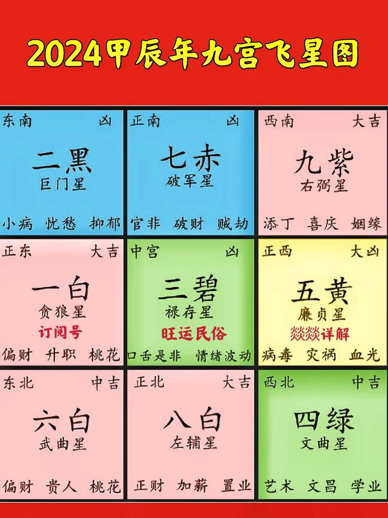第二步:找到你的流年飛星。流年飛星會(huì)隨著時(shí)間的變化而移動(dòng),它們分別掌管著不同的運(yùn)勢(shì)。比如,一白貪狼星代表財(cái)富,二黑巨門星代表健康,三碧祿存星代表事業(yè),以此類推。