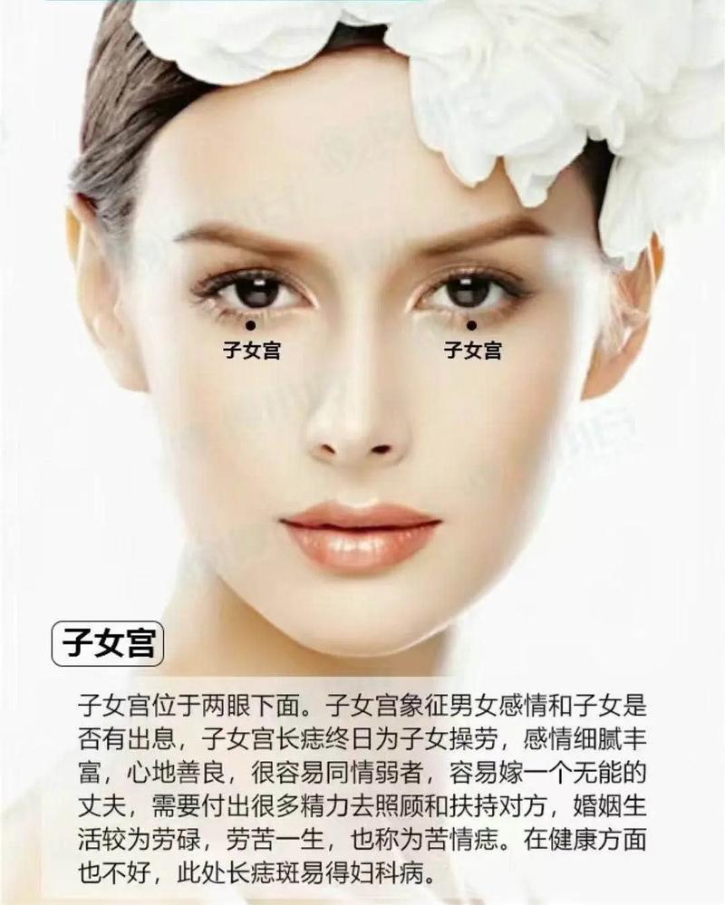 子女宮有黑痣的人,防止患有先天性的疾病,注意刑克問題,左眼下子女宮代表男,右眼下子女宮代表女。