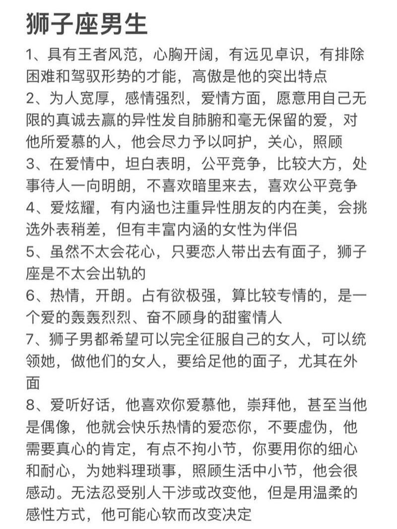 獅子座男生在戀愛中常常展現(xiàn)出自信、熱情和領(lǐng)導(dǎo)力,但也存在一些缺點(diǎn)。以下是對(duì)獅子座男生在戀愛中的表現(xiàn)及缺點(diǎn)的詳細(xì)分析: