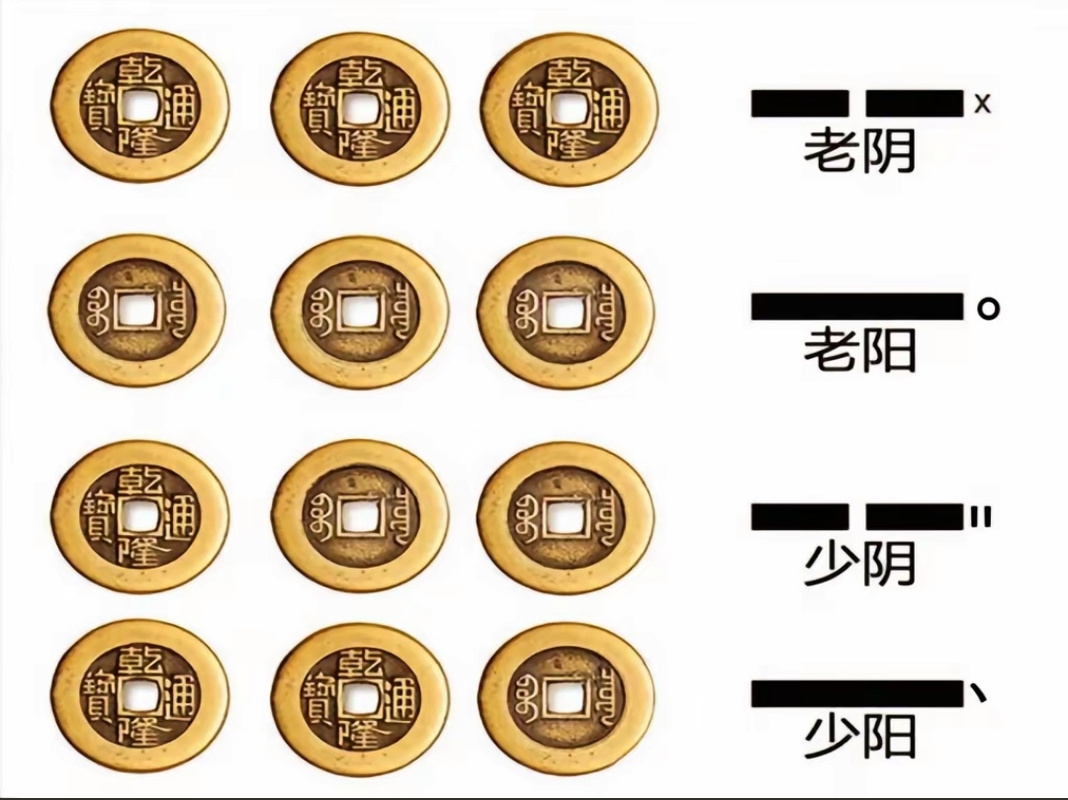 三個(gè)銅錢背面朝上,寓意為“三陰爻”,是最差的一種結(jié)果,象征著禍?zhǔn)逻B連、厄運(yùn)纏身。