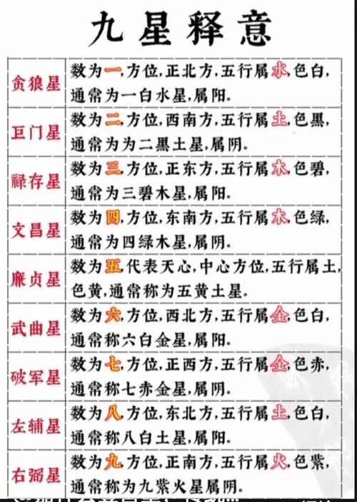 九星分別為: 一白貪狼星、二黑巨門星、三碧祿存星、四綠文曲星、五黃廉貞星、六白武曲星、七赤破軍星、八白左輔星、九紫右弼星。