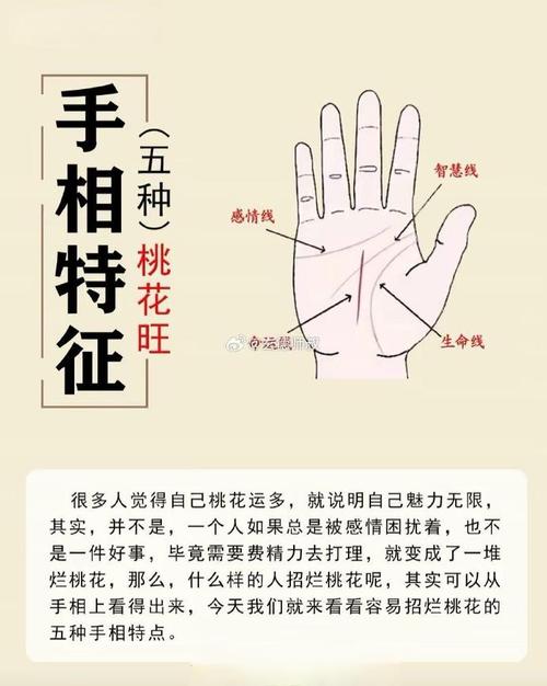 在手掌的感情線上或婚姻線上,出現(xiàn)一條細(xì)小且平行的線紋,稱為“桃花紋”。桃花紋的存在表明桃花運(yùn)旺盛,容易招來異性緣。