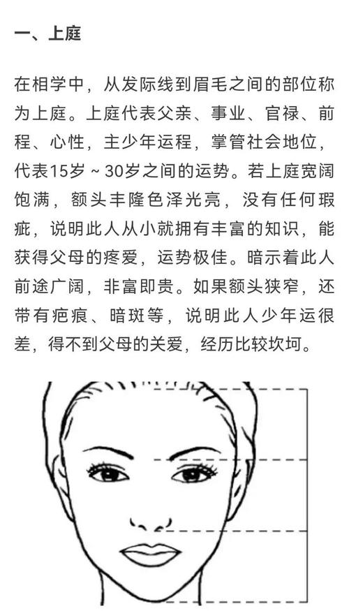 面相學(xué)將人臉劃分為上下三部分,分別為上停、中停和下停。其中,上停指額頭,中停指眉毛至鼻底,下停指從鼻底到下巴。