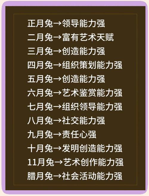 在中國(guó)傳統(tǒng)文化中,兔子被視為溫和、敏捷和聰明的象征。而對(duì)于十月出生的兔子而言,他們的命運(yùn)更是充滿了獨(dú)特的色彩與變化。這一時(shí)期的兔子不僅在性格上展現(xiàn)出不同尋常的特質(zhì),更在生活與事業(yè)中經(jīng)歷著令人驚嘆的旅程。接下來(lái),讓我們深入探討十月出生屬兔者的命運(yùn),看看他們?cè)谏畹奈枧_(tái)上如何閃耀。