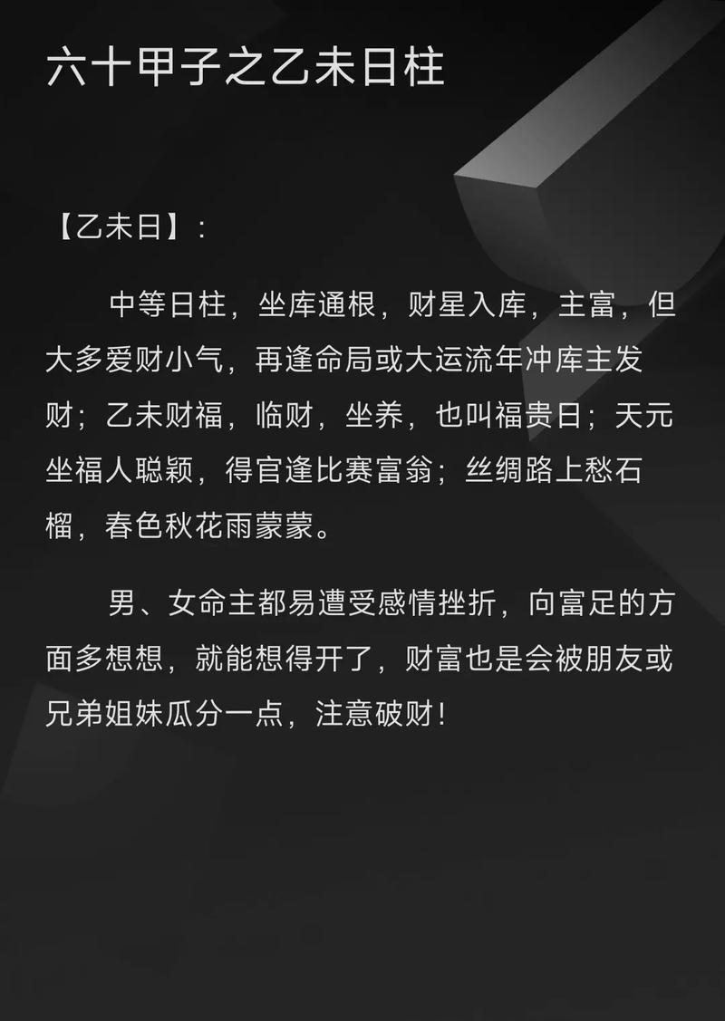 乙未日柱的性格特征乙未日柱的人通常性格溫和,富有同情心。他們像春風般輕柔,擅長與人溝通和建立關(guān)系。他們又有未土的務(wù)實一面,能夠在實際生活中腳踏實地,努力追求自己的目標。這種特質(zhì)使他們在社交和事業(yè)中都能游刃有余,成為朋友和同事眼中的“潤滑劑”。乙木的柔軟也可能讓他們在面臨壓力時表現(xiàn)出脆弱的一面。