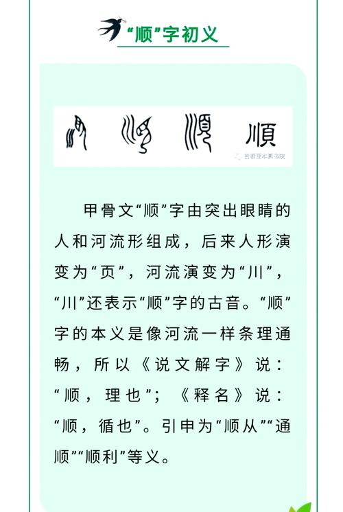 “順”字,寓意順?biāo)臁㈨樌?、順暢,寄托著人們?duì)人生旅途一路平坦、萬(wàn)事如意的美好期望。在姓名學(xué)中,“順”字的運(yùn)用并非隨意,其所蘊(yùn)含的五行屬性、字形結(jié)構(gòu)以及與其他字組合產(chǎn)生的意象,都會(huì)對(duì)命主的運(yùn)勢(shì)產(chǎn)生潛移默化的影響。想要深刻理解“順”字在姓名學(xué)中的奧秘,需從其字源、五行屬性、三才配置以及具體應(yīng)用等方面入手,進(jìn)行全方位的剖析。