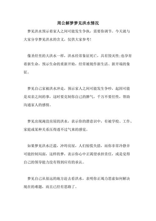 周公解夢(mèng)中對(duì)夢(mèng)中水的寓意解讀,為我們提供了豐富的參考和啟示。通過(guò)對(duì)水流狀態(tài)、水質(zhì)、水量等因素的分析,我們可以更深入地了解自己的內(nèi)心世界和事業(yè)運(yùn)勢(shì),從而做出更加明智的判斷和抉擇。