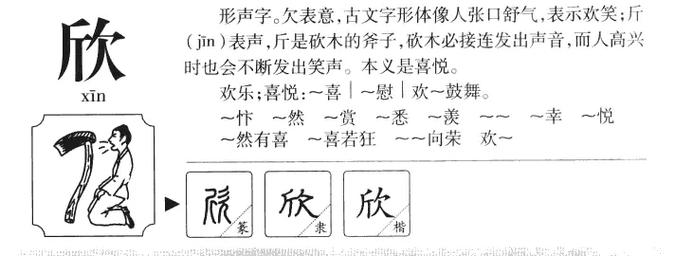 “欣”字,從字形上看,左邊為“斤”,右邊為“欠”。“斤”代表斧頭,有開創(chuàng)、劈開之意;“欠”代表張口,表示歡笑、喜悅。“欣”字的本義是喜悅、快樂。在姓名學(xué)中,“欣”字象征著 積極樂觀 與 人緣魅力。