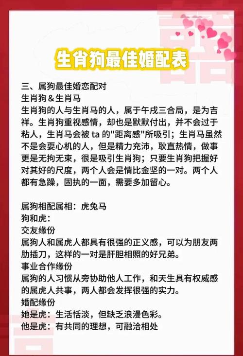 屬狗的人性格忠誠(chéng)、沉穩(wěn),對(duì)感情專一。他們可能更傾向晚婚,因?yàn)樗麄兿M业揭粋€(gè)能與自己相伴一生的伴侶。他們不會(huì)輕易開(kāi)始一段感情,一旦開(kāi)始,就會(huì)認(rèn)真對(duì)待,不輕易放棄。