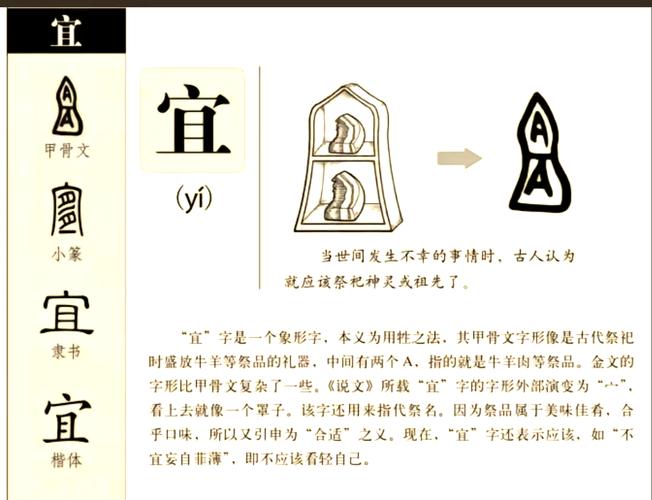“宜”字本身的五行屬性尚存爭議,但通常被認為是_偏向于木屬性_,因為“且”有生發(fā)之意,與木的生長特性相符。在姓名學(xué)中,“宜”字與其他五行屬性的字搭配,需要特別注意。
