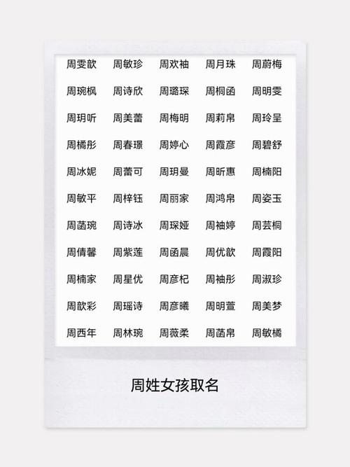 美好祝愿: 可以選擇寓意健康、幸福、平安、吉祥的字,如:周安琪、周怡寧、周夢瑤。