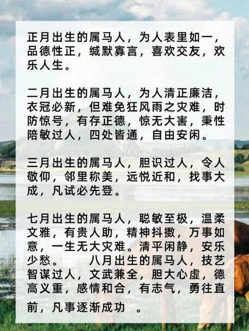 在中國傳統(tǒng)文化中,生肖不僅是一個時間的標(biāo)識,更是一個人性格、命運(yùn)的象征。屬馬的人,尤其是在農(nóng)歷八月初一出生的,更是被賦予了獨(dú)特的命運(yùn)特征。他們?nèi)缤E馬一般,生機(jī)勃勃、活力四射,但在這份活力背后,又潛藏著怎樣的挑戰(zhàn)與機(jī)遇呢?