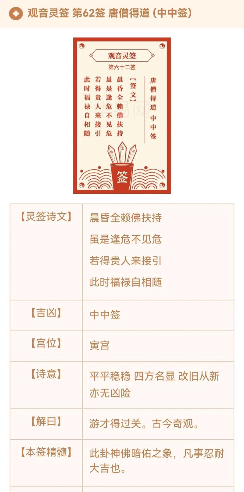 觀音靈簽第五十八簽為中簽,簽文為:“日出山中萬象明,云散風(fēng)清月半明。桑榆未晚猶及艾,貴人提攜建奇功。”