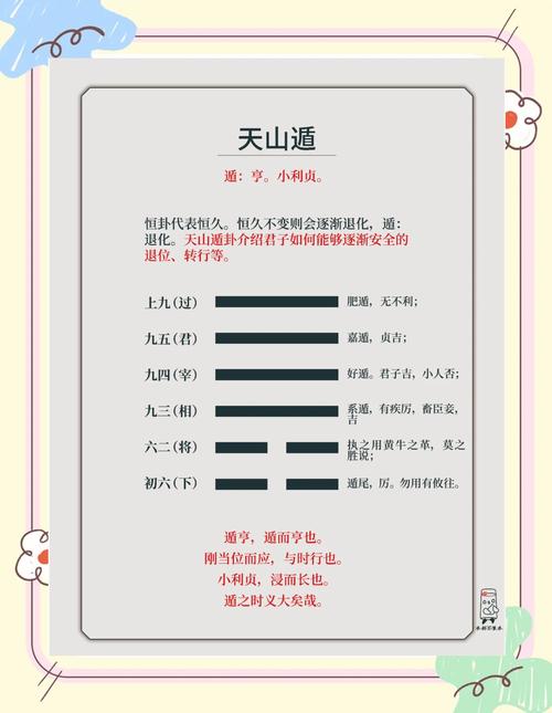 天山遁卦,上卦為天,下卦為山。天在上,山在下,寓意著天高地厚,萬物歸藏。此卦象征著遁世隱退,躲避災禍。