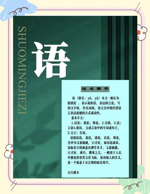 彰顯才華與智慧: “語”字也暗示著一定的文化素養(yǎng)和內(nèi)在智慧。人們常說“出口成章”、“妙語連珠”,可見語言表達(dá)能力與才華是密不可分的。以“語”字入名,也寄托了希望孩子聰明好學(xué),才華橫溢的美好祝愿。
