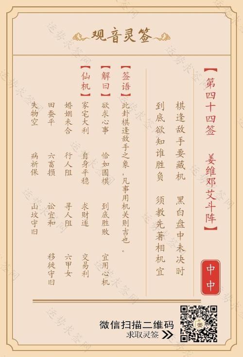 觀音靈簽第四十四解勸誡人們?cè)谟龅嚼щy時(shí),不要疑慮不決,要堅(jiān)定信心。因?yàn)樽杂匈F人相助,會(huì)幫助你渡過難關(guān)。