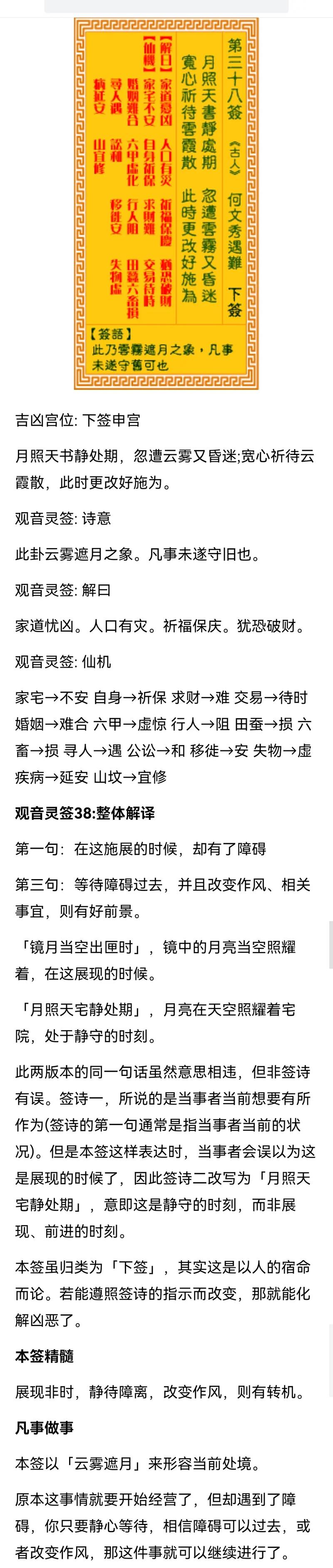 如果你抽到了觀音靈簽第38簽,那么恭喜你,這是一個非常吉利的簽。這簽的簽文是:“不畏浮云遮望眼,終有柳暗花明時?!币馑际钦f,不要害怕眼前的困難和挫折,只要你堅持不懈,最終一定能取得成功。