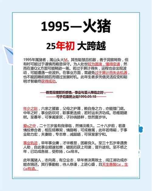 1995年是農歷的豬年,生肖豬在中國傳統(tǒng)文化中象征著財富、繁榮與幸福。每一個出生在這個年份的人,都被認為擁有獨特的命理特征,帶著濃厚的“豬”氣息。我們將深入探討1995年豬年人的命運特點,以及他們在生活、事業(yè)和感情上的潛在發(fā)展。
