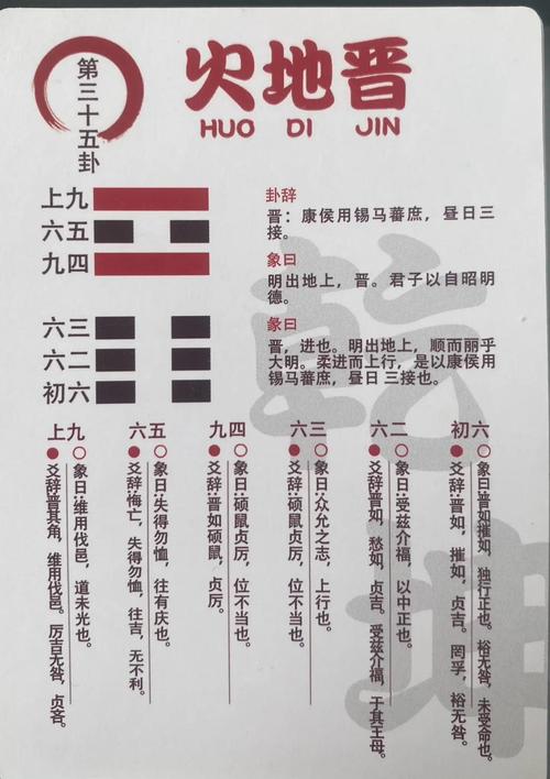 晉卦,下坤上離,坤為地,離為火。地中生火,火勢(shì)旺盛,光明四射。此卦象徵著光明、進(jìn)步、發(fā)展。