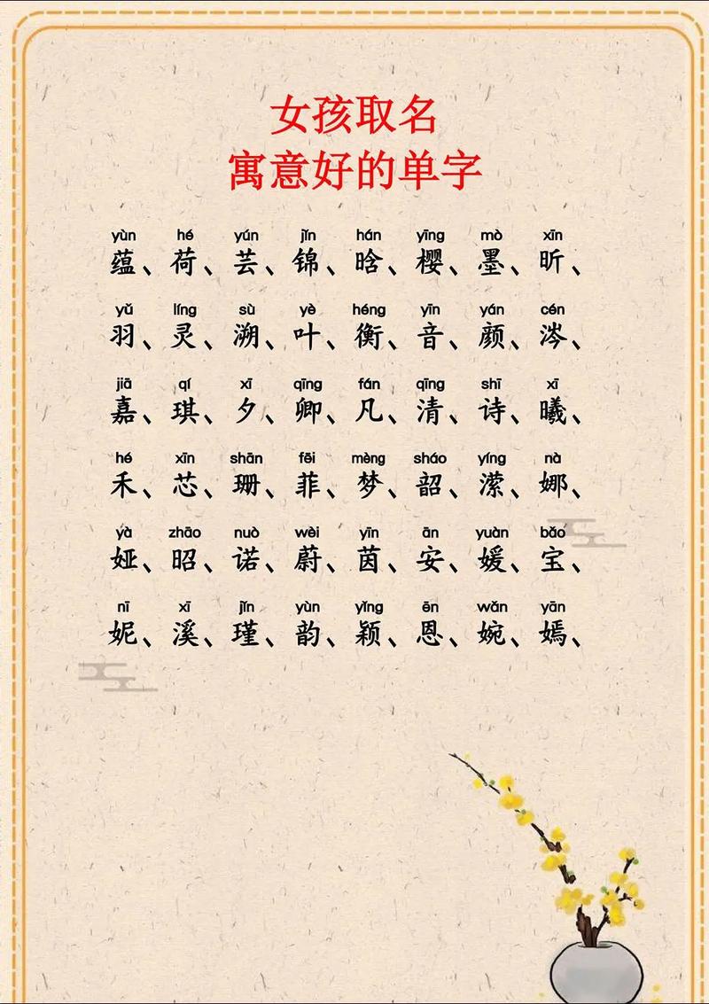 惠、雅、麗、娜、嫻、柔、美、善、晴、欣