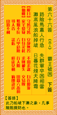觀音靈簽66簽,寓意化兇為吉,逢兇化吉。遇事需謹(jǐn)慎,不可輕舉妄動(dòng)。多行善積德,廣結(jié)善緣。凡事量力而行,不可貪功冒進(jìn)。