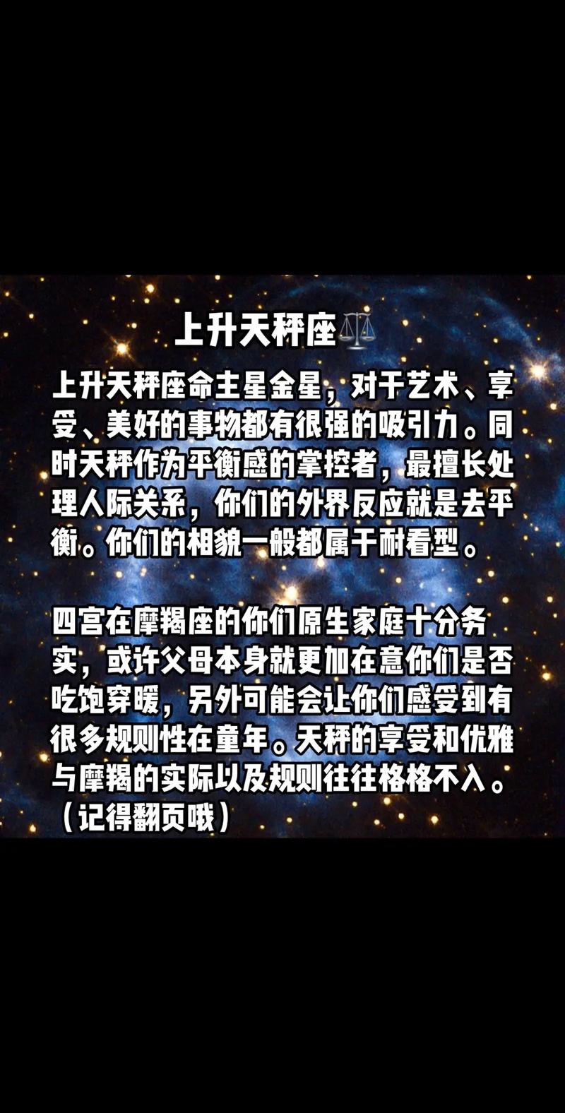 上升天秤座賦予你迷人的外表和舉止優(yōu)雅的氣質(zhì)。你對美有著敏銳的感知力,注重儀容儀表,給人留下深刻的印象。同時,你待人接物彬彬有禮,尊重他人,善于維護良好的社會關(guān)系。