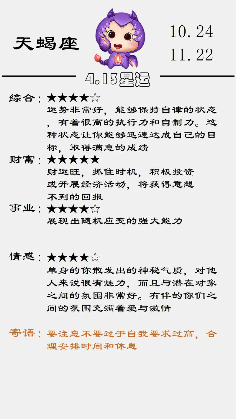 天蝎座的財(cái)富旅程前景光明天蝎座的財(cái)富運(yùn)勢(shì)在未來將繼續(xù)保持強(qiáng)勁的增長勢(shì)頭。憑借其獨(dú)特的洞察力和堅(jiān)定的決策能力,天蝎座能夠在不斷變化的財(cái)務(wù)環(huán)境中找到自己的位置,實(shí)現(xiàn)財(cái)富的長足進(jìn)步。通過科學(xué)合理的理財(cái)策略和不斷的自我提升,天蝎座的財(cái)富之路必將越來越寬廣,前景無限光明。如果你是天蝎座或關(guān)心天蝎座的財(cái)運(yùn),希望這篇文章能為你提供寶貴的參考和啟發(fā)。