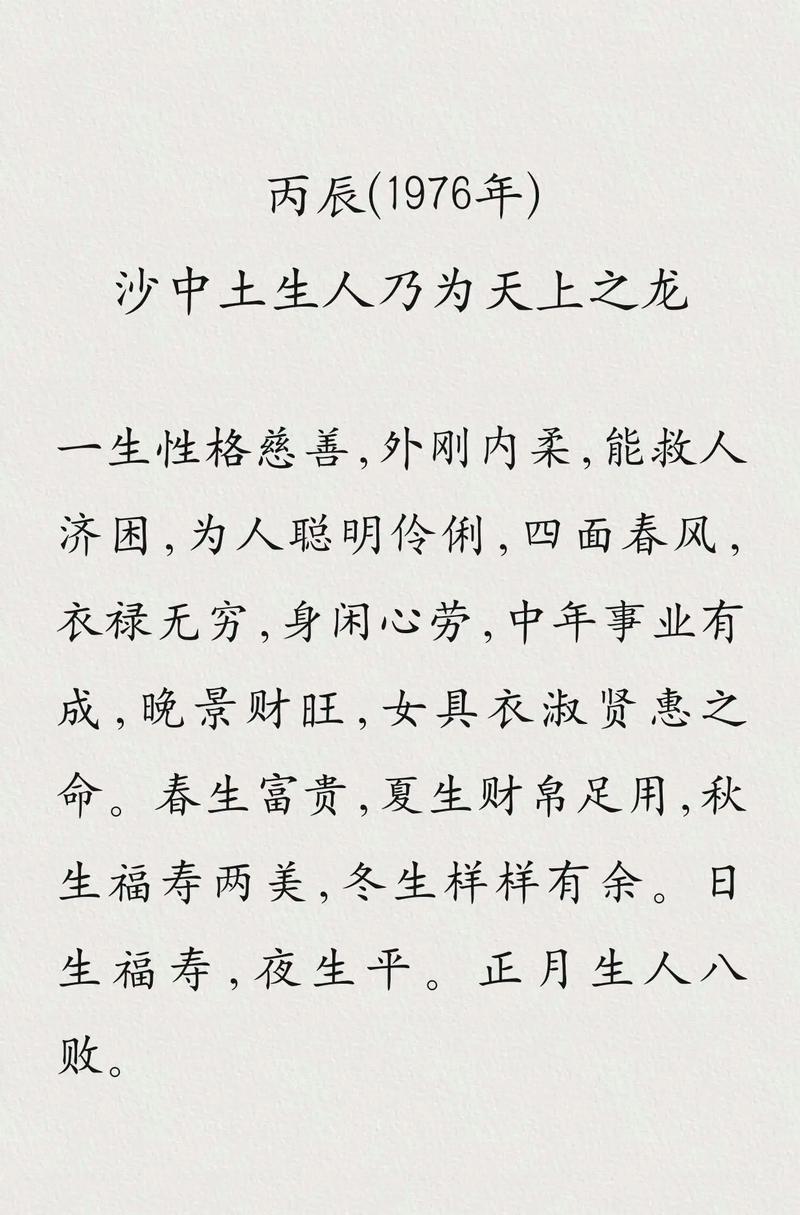 1976年屬龍,五行屬土,納音為丙辰龍,即火龍。土龍缺金,因金能生水,而水能滋養(yǎng)木,木能克制土。