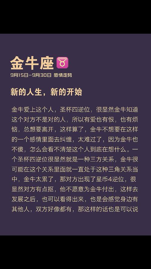在金牛座的星象圖中,9月將是一個充滿情感波動和機遇的月份。對于金牛座的人來說,這段時間的感情走勢如同一幅復(fù)雜的風(fēng)景畫,既有晴空萬里,也有風(fēng)雨交加的瞬間。本文將深入解析9月金牛座的感情走勢,幫助你把握愛與挑戰(zhàn)的交織。