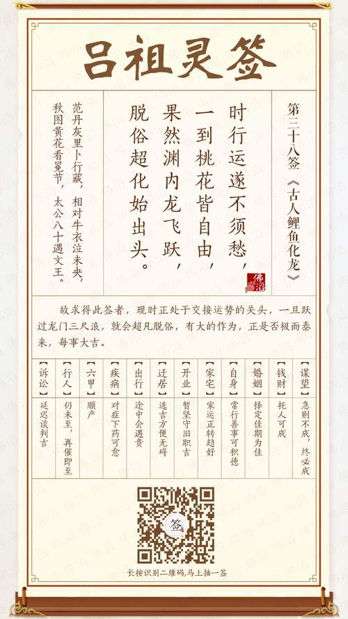 從簽文來看,呂祖靈簽第38簽告訴我們,一個(gè)人的功名富貴全都掌握在自己手中,不要羨慕別人的成就,雖然才華橫溢,恃才傲物,但最終還是要靠自己腳踏實(shí)地去實(shí)現(xiàn)。
