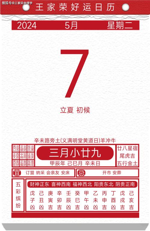 農(nóng)歷與陰陽(yáng)五行的關(guān)系根據(jù)中國(guó)農(nóng)歷,日期的選擇通常與陰陽(yáng)五行息息相關(guān)。5月7日,農(nóng)歷四月,正處于春夏之交。這個(gè)時(shí)期,陽(yáng)光逐漸強(qiáng)烈,萬(wàn)物復(fù)蘇,象征著生機(jī)與希望。從五行的角度看,這一天的元素與土、火相結(jié)合,適合進(jìn)行播種、開(kāi)業(yè)等吉利活動(dòng)。