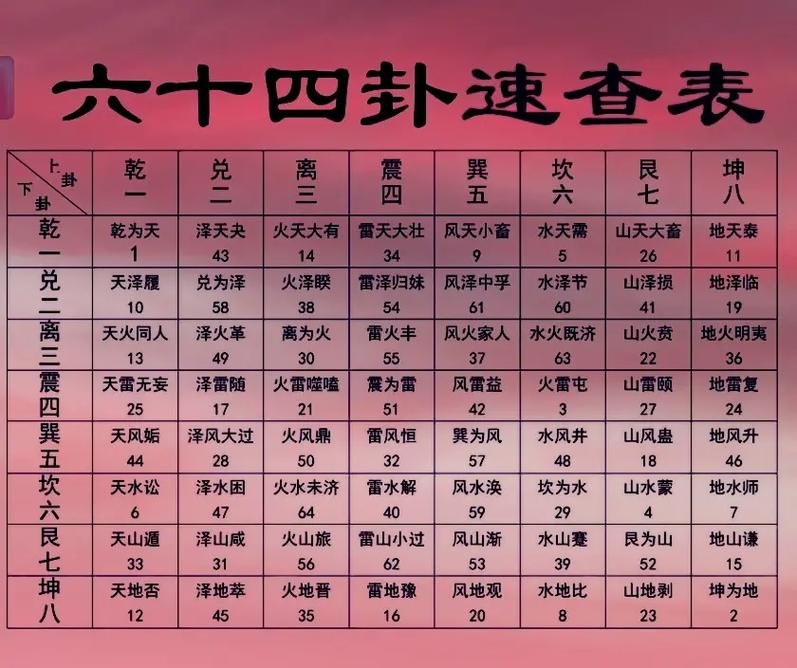 六十四卦是《周易》中的核心內(nèi)容,每一卦都代表了不同的自然現(xiàn)象和人事?tīng)顟B(tài)。了解六十四卦的吉兇對(duì)于預(yù)測(cè)未來(lái)和做出決策具有重要意義。以下是對(duì)六十四卦吉兇的詳細(xì)對(duì)照表。