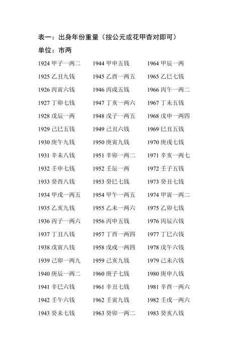 1. 確定出生年份的重量:根據(jù)出生年份的天干地支,查找對應(yīng)的重量。例如,甲子年對應(yīng)一兩二錢,乙丑年對應(yīng)九錢,依此類推。