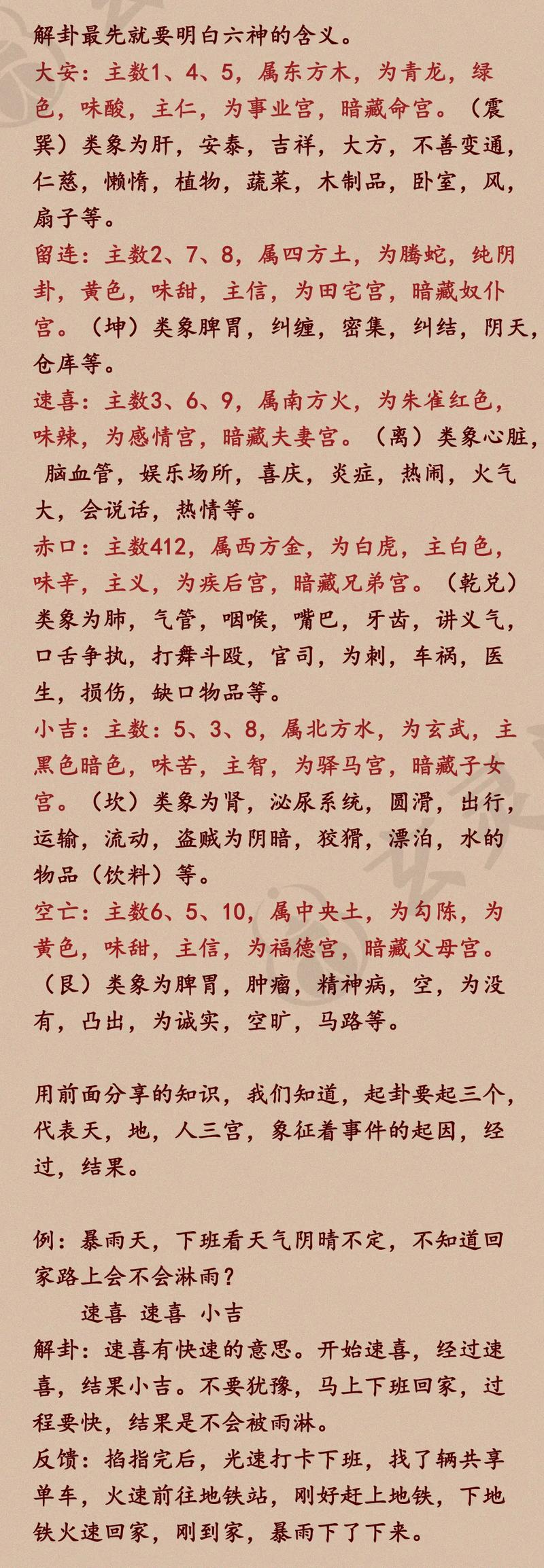 4. 空亡與其他六神的關系:小六壬的六神中,除了空亡外,其他五個神將(大安、留連、速喜、赤口、小吉)都有其固定的吉兇含義??胀鐾ǔ1灰暈橐环N不吉利的象征,但在某些情況下,空亡的力量可能較弱,需要結合其他神將的結果和具體情況進行綜合判斷。