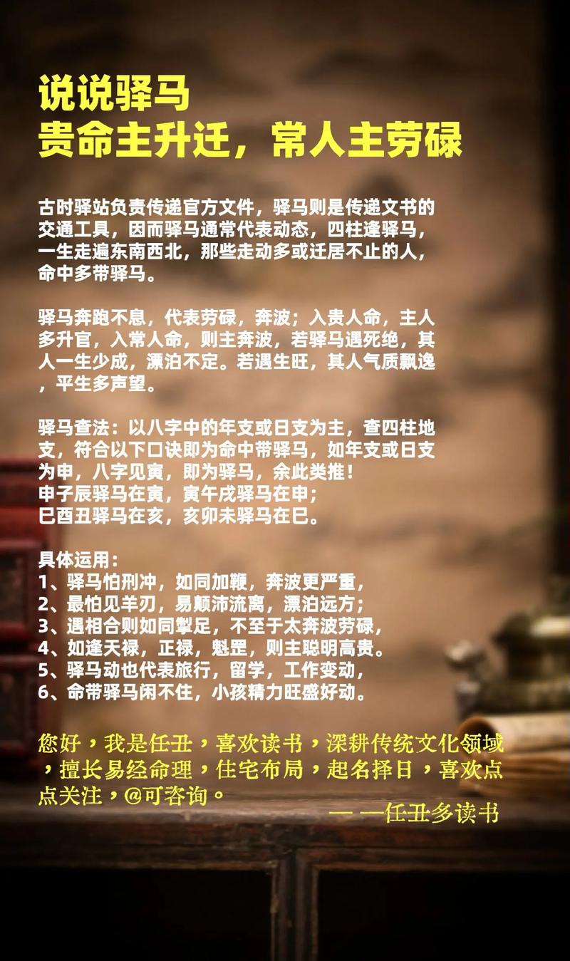 驛馬神煞源于中國古代的驛站制度,指的是為國家傳遞公文、軍事情報的馬匹。在命理學中,驛馬象征著動態(tài),代表走動、奔波、遷移等。